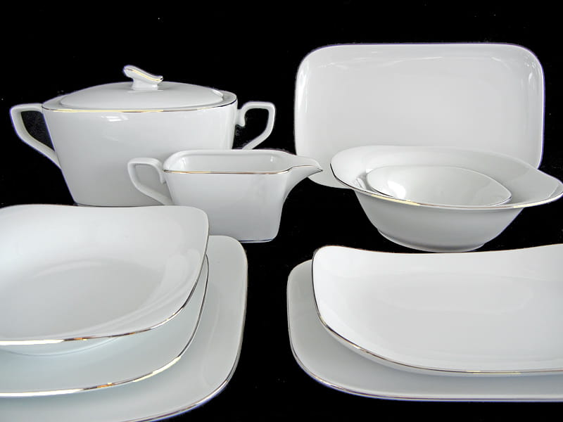 Serwis obiadowy Auris na 12 osób, w wersji złotej ręcznie malowanej linii na kwadratowej porcelanie.